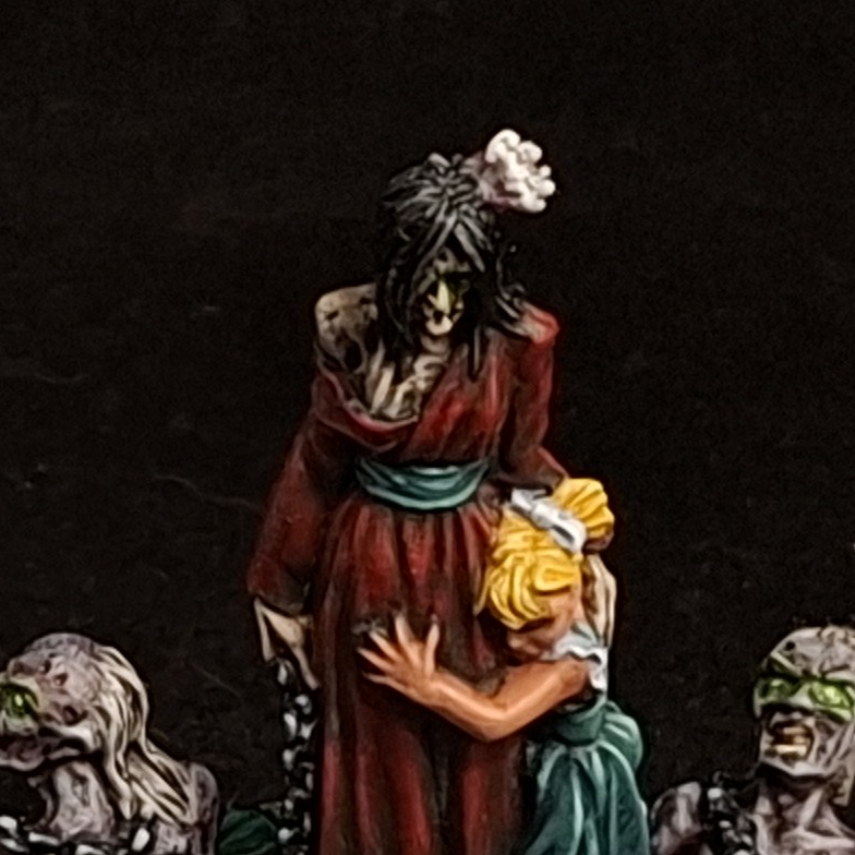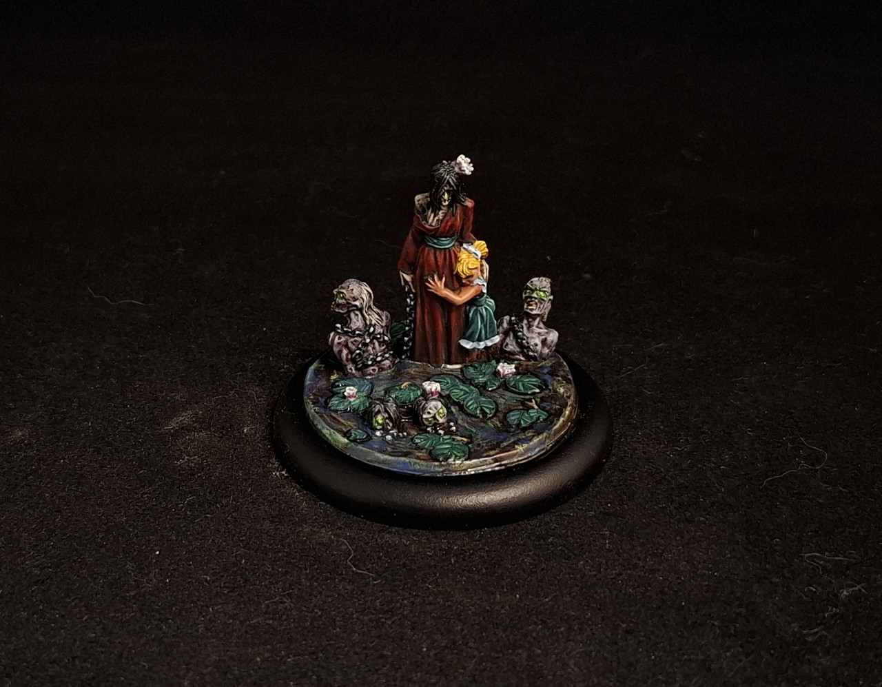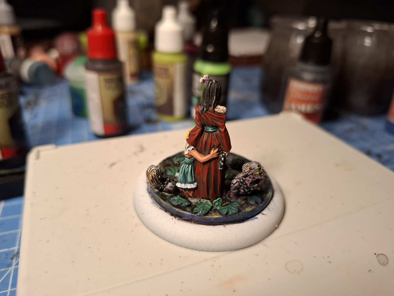 Comme je bloquais sur tout ce que j'ai entamé... j'ai entamé quelque chose de nouveau. Dans le cadre du concours trimestriel de Warmania. C'était un concours à thème, le thème était Effrayant. Je me suis motivé, à la dernière minute (commencé pile poil une semaine avant la fin du délai). J'ai ressorti il y a peu pour Sorcerer's Deck of Death (on en reparle bientôt) mes Kirai de Malifaux qui n'avaient jamais vu la table, afin de faire office de deux fois nés. Cela m'a rappelé qu'une partie des figs que j'avais acheté dans le lot n'était pas peinte et que l'une d'entre elles en particulier, était bien flippante. Voilà comment j'ai jeté mon dévolu sur la Jaakuna Ubume, inspiré du Yokai japonais éponyme (Ubume), né d'une femme morte en couche...