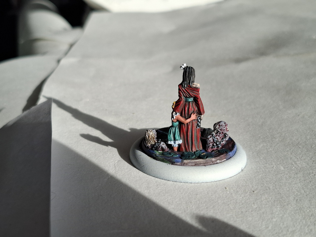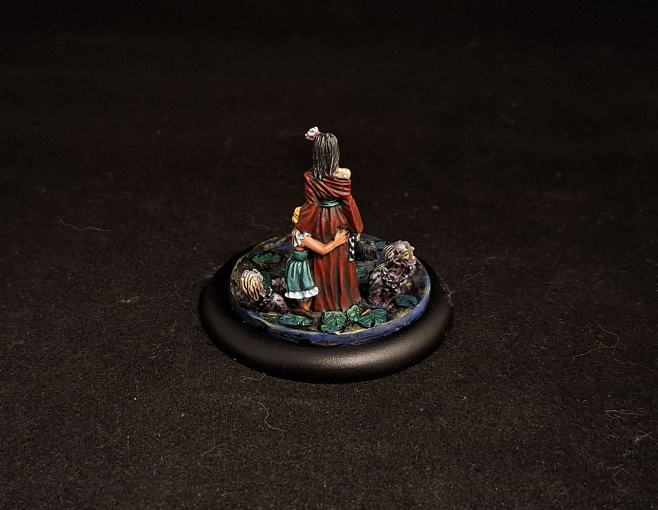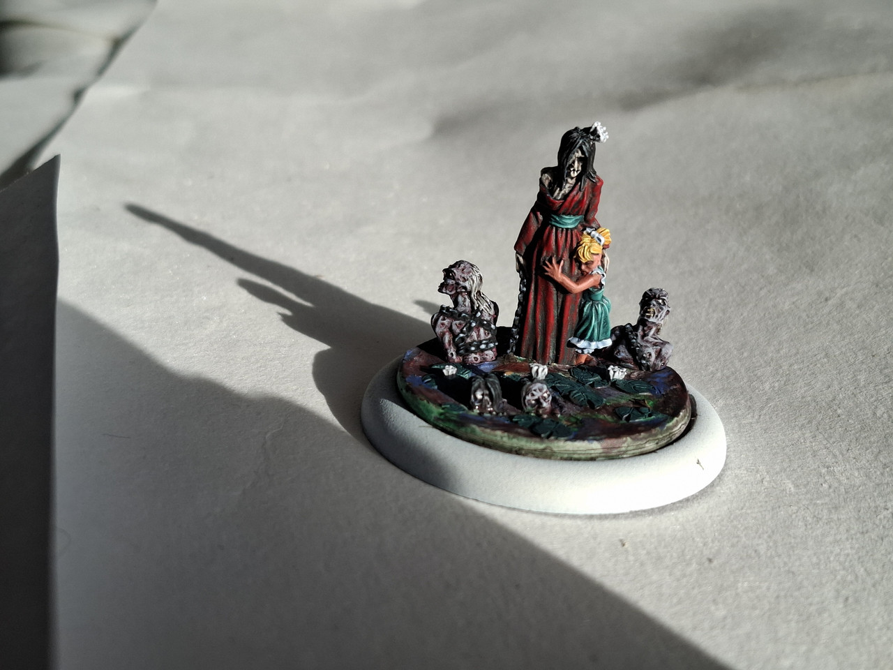 Comme je bloquais sur tout ce que j'ai entamé... j'ai entamé quelque chose de nouveau. Dans le cadre du concours trimestriel de Warmania. C'était un concours à thème, le thème était Effrayant. Je me suis motivé, à la dernière minute (commencé pile poil une semaine avant la fin du délai). J'ai ressorti il y a peu pour Sorcerer's Deck of Death (on en reparle bientôt) mes Kirai de Malifaux qui n'avaient jamais vu la table, afin de faire office de deux fois nés. Cela m'a rappelé qu'une partie des figs que j'avais acheté dans le lot n'était pas peinte et que l'une d'entre elles en particulier, était bien flippante. Voilà comment j'ai jeté mon dévolu sur la Jaakuna Ubume, inspiré du Yokai japonais éponyme (Ubume), né d'une femme morte en couche...