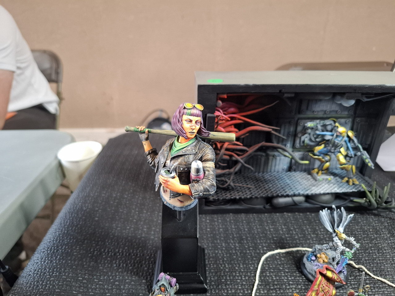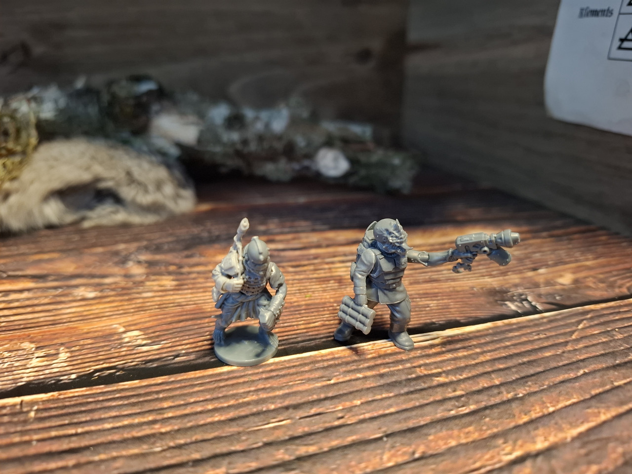 Pour ma part j'ai réalisé deux citoyens des ruches avec ce que j'ai pu dénicher. Un assez simple ne mêlant que des pièces Games Workshop de garde impérial et de culte genestealer / tyranide. Le second était plus tricky, je pense que ce sont des jambes de zombie ou de goule Mantic, un corps de figurine historique (landsknecht ?), un gras avec fusil laser inconnu, le second venant d'une grappe frostgrave, une tête de mechanicus et un couteau sur la jambe de provenance totalement inconnue.