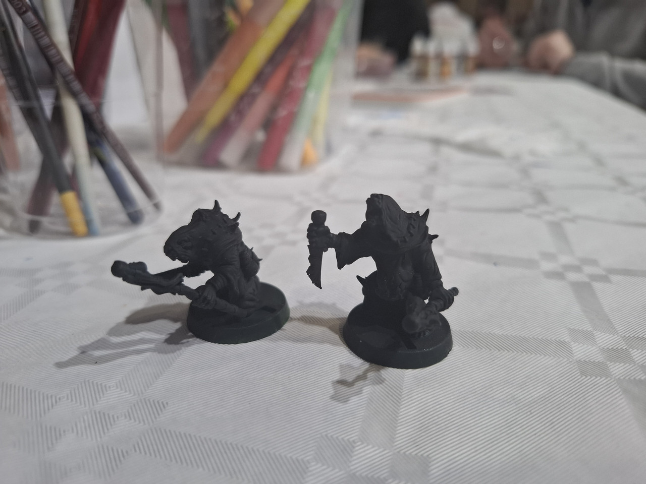 Il y a deux ans j'avais pu participer à un speedpaint sur une ancienne figurine des JfJ (la gobeline chamane). Cette année on nous a dit que cet événement ne serait pas organisé mais... Comme on est un peu têtus avec ma moitié, on s'est imposé notre contrainte 1h tous seuls comme deux maso pendant qu'autour de nous ça peignait tranquillement. Les bénévoles nous ont gentiment fournis chacun une figurine de skaven pestilien (impression 3D) sous-couché en noir. Pas identique mais clairement de même origine.