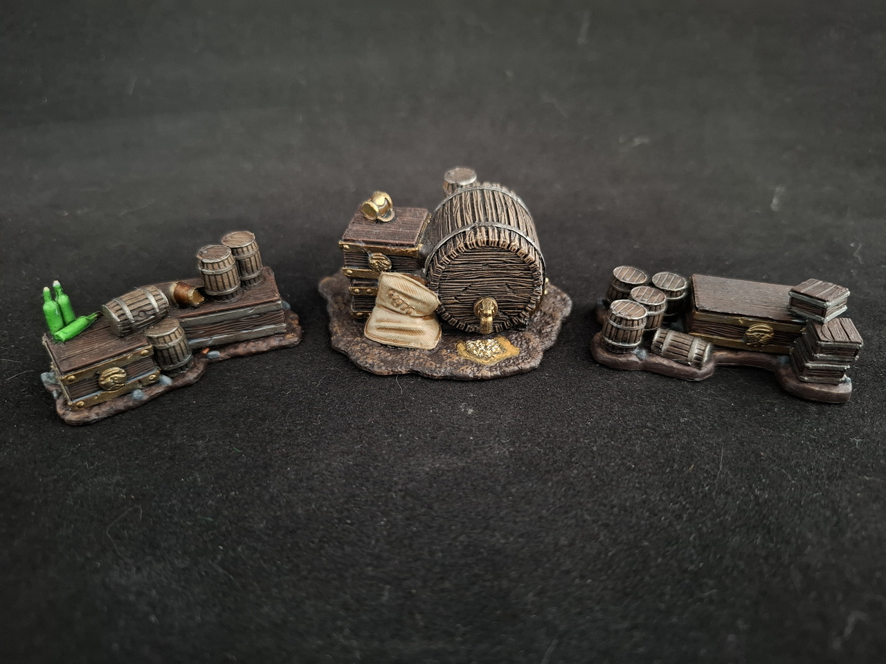 De mémoire, le zénithal sur les décors Guildball était un peu moins appuyé donc j'ai fait un brossage derrière pour réhausser. Contrast aussi sur les petits détails : choppes, bouteilles, sacs, cordes, sceau... Le métal est traité de façon plus classique. La bière et sa mousse sont su pseudo-brossage.