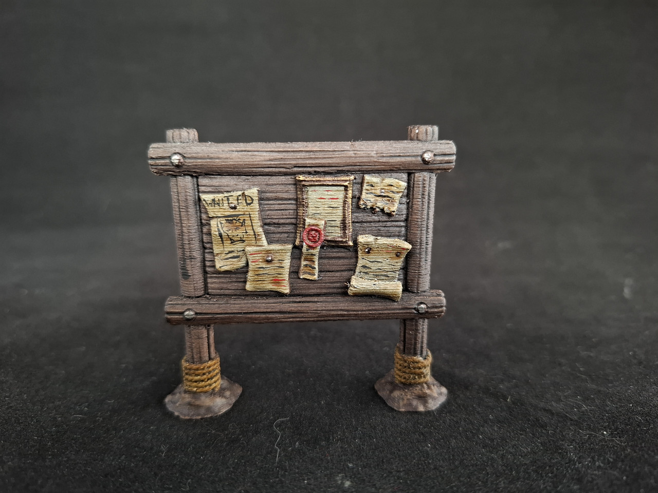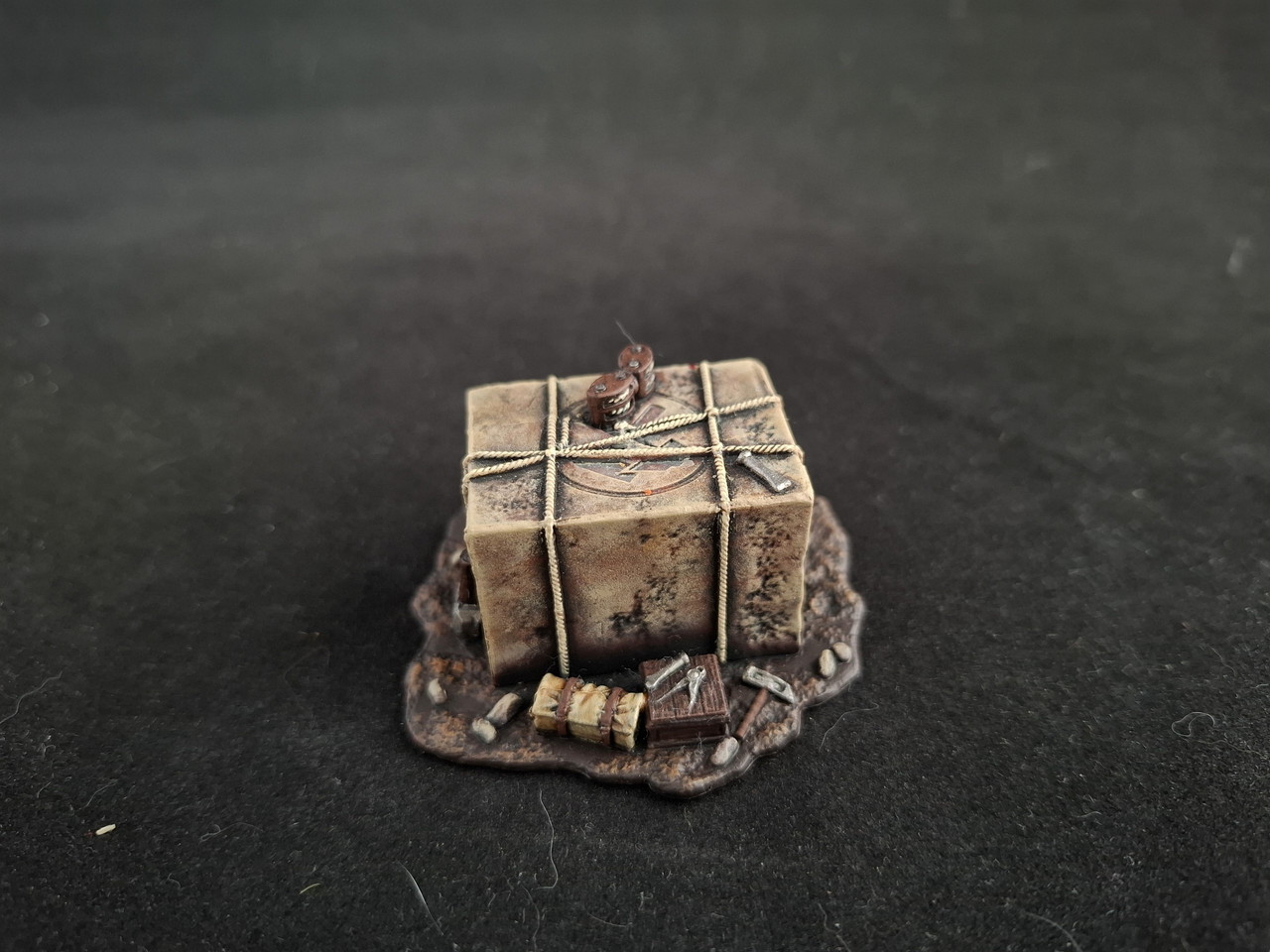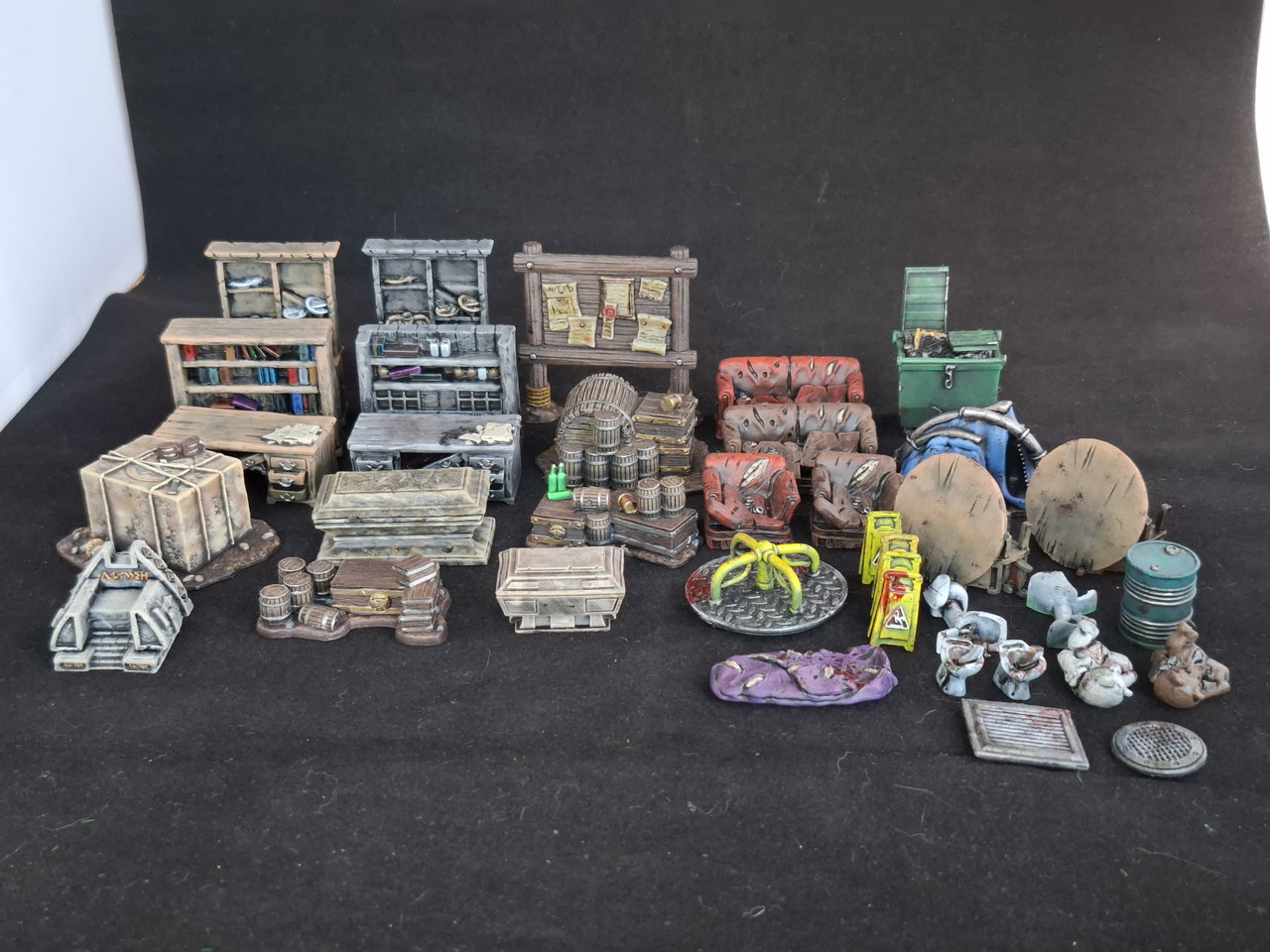 Petit indice avec la photo précédente, j'ai cette fois-ci pris les décors qui matchaient avec du Fallout (même si la partie / mini campagne ne s'est jamais faite) ainsi que divers décors en bois et en pierre pour du medfan. J'ai tout sous-couché en noir, puis usé et abusé de l'éponge, ce qui marche toujours à merveille, même ici. Sans plus de palabres, place aux photos !