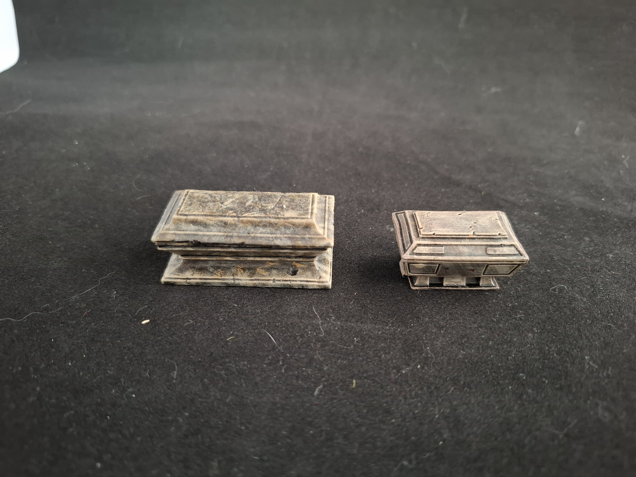 | Tombeau reaper au brossage pinceau, le fort restant de noir donne un effet marbre. Le petit est de Dungeon Saga il me semble et est traité à l'éponge. |