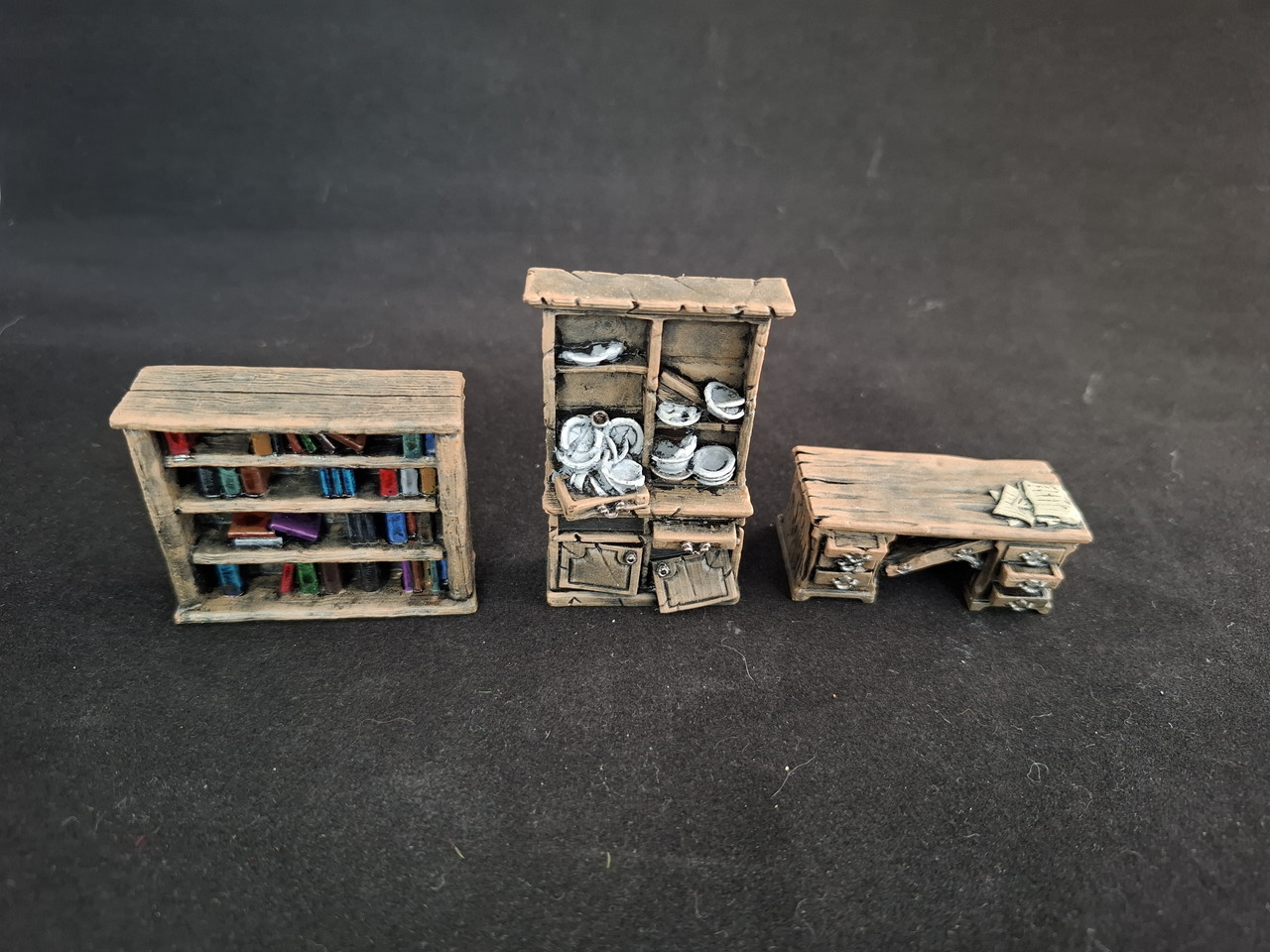 Côté medfan, c'est plus sage. J'ai utilisé deux teintes de bois différentes (toujours travaillés à l'éponge) pour ne pas non plus avoir tous les meubles de la même teinte, potentiellement pour avoir deux ambiances ou meuble deux salles différentes, d'autant que ce sont des pièces identiques. Beaucoup moins emballé en revanche lorsqu'il s'agissait des moults détails des bibliothèques / armoires... J'ai fait du rapide, j'espère que ce n'est pas trop choquant.